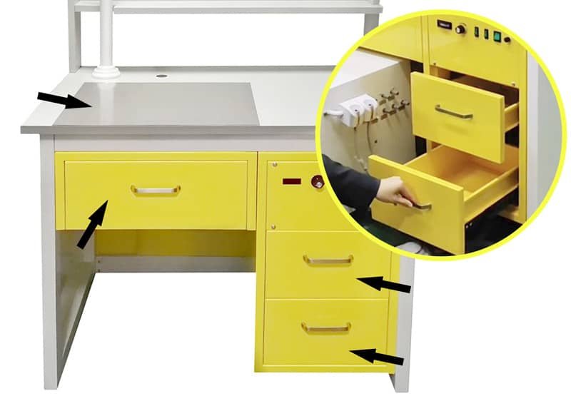 Dental simulator- with 3 large drawers, and is designed to be used as a lab bench. One table two usages. For multi-functional usage, the working table surface is more fireproof, more safe, and has a better overall performance.