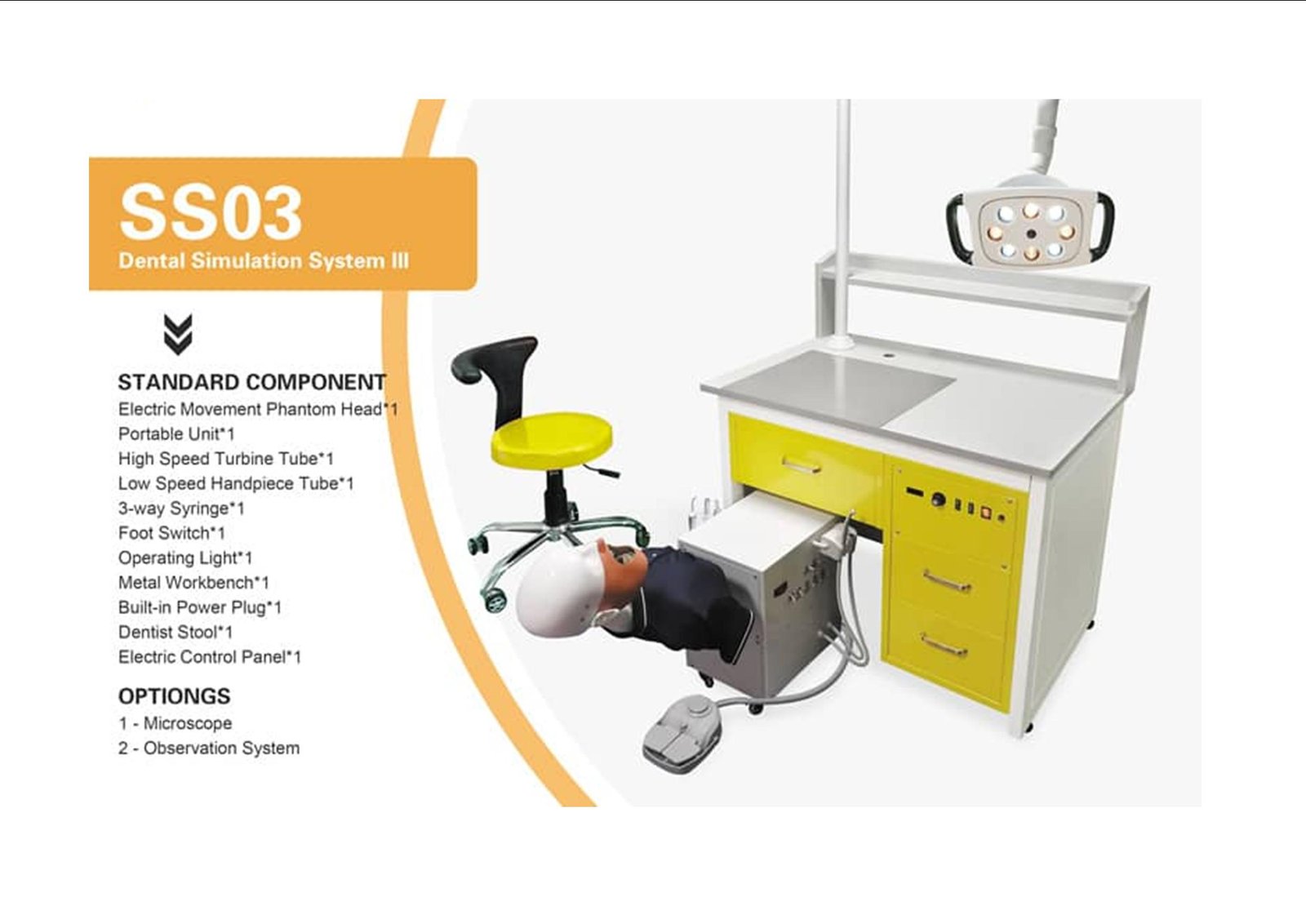 Electric control with simulator (head, portable unit, lab table, LED sensor light). Great integration for multimedia education and false tooth repair. It is a model machine for use in stomatology colleges and laboratory settings.